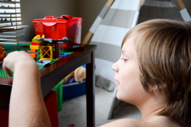 This particular day, Navy was taking a nap and I caught Bossy up there alone playing. And my mammarrazi self wanted to document this moment in time where I know one day I'll want to look back at. The way his hair covers his ears, his cute little profile and the table he plays his legos on.